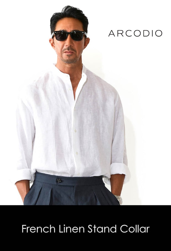すっきりと立ち上がる襟が顔まわりをスマートに見せ、上品さと抜け感を両立します。上質なフレンチリネンは通気性・吸湿性に優れ、軽やかで快適な着心地。