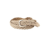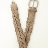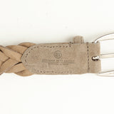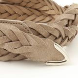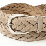 柔らかなスウェードレザーを上品に編み上げた、表情豊かなメッシュベルト。起毛感のある素材がコーディネートに奥行きを与え、ほどよく力の抜けた大人の雰囲気を演出します。ラウンドフォルムの真鍮製バックルと先端のプンターレがきちんと感をキープしてくれるため、ジャケットスタイルやキレイめカジュアルにも相性抜群です。