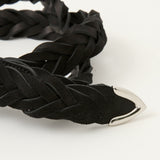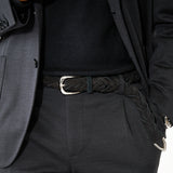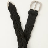 柔らかなスウェードレザーを上品に編み上げた、表情豊かなメッシュベルト。起毛感のある素材がコーディネートに奥行きを与え、ほどよく力の抜けた大人の雰囲気を演出します。ラウンドフォルムの真鍮製バックルと先端のプンターレがきちんと感をキープしてくれるため、ジャケットスタイルやキレイめカジュアルにも相性抜群です。