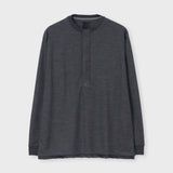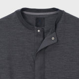 長袖のヘンリーネックは、深めのフロント前立てにはボディ同色のウール生地を使用して高級感をプラス。さらに隠しドット釦仕様のメタル感もさり気ないアクセントに。前立て下部にWJL刺繍が入ります。