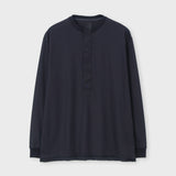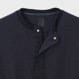 長袖のヘンリーネックは、深めのフロント前立てにはボディ同色のウール生地を使用して高級感をプラス。さらに隠しドット釦仕様のメタル感もさり気ないアクセントに。前立て下部にWJL刺繍が入ります。