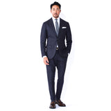 ジャケットは、ネイビーがシングル2ボタン、ミディアムグレイのほうがダブル6ボタンで、ともにセットアップで着られる共地のスラックスも用意しています。チョークストライプとはいっても、柄の主張は控えめで、上品に見えるのもこだわった点。メランジェ調の素材感も、着こなしに奥行きを与えてくれます。