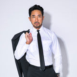 白のタイプはタイドアップが基本ですが(ほぼコスプレですが、上にジャケットをはおると普通のドレスシャツに見えます)、黒はカジュアルにジーンズなどと合わせて着ることも。もちろん、黒のスーツに黒のシャツの組み合わせもカッコいいですよ!