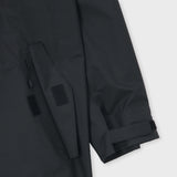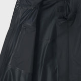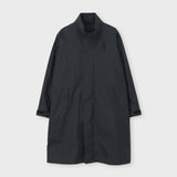素材の特性を活かしてシームテープで組み立てたスタンドカラーのロングコート。スタンドカラー内にはフードを収納し、小雨に対応。