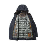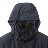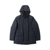 フードはダブルファスナーで着脱が可能。フロントは表から見えないスナップボタンで開閉でき、すっきりとした印象に仕上げています。胸元にはボタン付きのウェルトポケット、サイドにはフラップとボタンを備えたプリーツ入りポケットを配置。機能性と洗練されたデザインが融合した一着です。