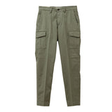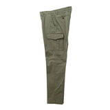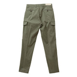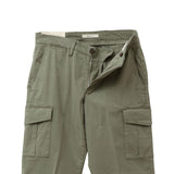カーゴパンツ特有の無骨さは程よく残しつつ、ノープリーツと細身のシルエットで都会的に仕上げています。両玉縁ポケットやコインポケットを配したスラックスライクな表情に、BRIGLIA刻印のオリジナルボタンがさりげないクラス感を添えます。