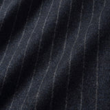 生地の重厚感と適度なハリ感を付与し、アイテムのディテールが綺麗にでる仕立て映えのする生地に仕上がっています。また、ピリングが出来にくくなる様に糸密度をアップさせ、Super140'sの特性 である暖かみを残しながらも表面感をスキっとキレイに仕上げてあります。まるで布帛のような高級感のあるチョークス トライプも魅力です。