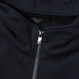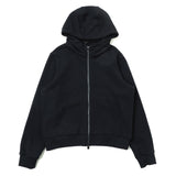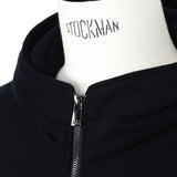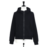 こちらは立ち襟仕様でフードのシルエットが崩れにくい裏毛フーデッドパーカー。フロントには、カンガルーポケットを配置。フォルムの変化を楽しめる、ダブルファスナー仕様も特徴のひとつ。裾や袖口をRIBに切り替え、メリハリのあるシルエットに。左の袖口には同色のブランドレターをあしらいました。ラフなカジュアルスタイルが完成する、デイリーユースにおすすめの一着です。