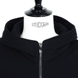 別注のダウン入りのMA-1は、従来モデルより約40%ダウン量を減らして軽量化。丸めてもシワにならず、出張バッグに入れてもかさばりません。色はダークネイビーで統一し、ライダースやコートとも相性抜群です。フーデッドパーカーとジョガーパンツも別注で、表コットン・裏ウールカシミヤの裏毛を使用。フードは襟元を高くしてMA-1と重ねてもバランスがよく、ジッパーやロゴなど細部もこだわり抜きました。