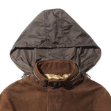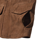 素材に選んだのは、しっとりとした質感と奥行きのある表情が魅力のゴートスウェード。オリジナルの4ポケットや比翼仕立てといった基本的なディテールは踏襲しながらも、上質な素材に替えることで一気に品格が生まれます。さらに、M-65本来の「隠しフード」も、きちんと襟元に収納。あくまで実用性を背景にしたディテールですが、こういう「語れる要素」があると、服はぐっと楽しくなるんですよね。