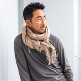 羊毛を使ったウール素材のストールは、繊維が太く固いものが多いのでチクチクしやすい傾向があります。天然繊維でただ一つのフィラメントであるシルクを使用することで不快なチクチク感がなく、カシミアのような暖かな風合いと、独特な滑らかさを兼ね備えたストールに仕上がってます。