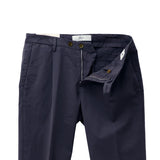まず定番中の定番が、1プリーツのコットンパンツ「BG07」。ストレッチ性のあるツイル織りのコットン生地は、はいた瞬間から心地よく、それでいて見た目は驚くほどエレガントです。スリムなシルエットにワンプリーツを組み合わせることで、カジュアルにもジャケットにも自然になじみます。製品染めのコットンならではの味わいがはき込むほどに増していくのも魅力で、どこか昔のラルフ・ローレンのチノーズを彷彿とさせる雰囲気がありながら、あくまでイタリア仕立ての美しさがあります。個人的にも毎シーズン買い足しているモデルで、気づけば全色揃ってしまいました。なかでも出番が多いのはホワイト、ネイビー、グレー。この3本があれば、一年中活躍してくれます。