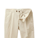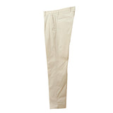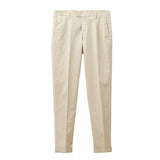 まず定番中の定番が、1プリーツのコットンパンツ「BG07」。ストレッチ性のあるツイル織りのコットン生地は、はいた瞬間から心地よく、それでいて見た目は驚くほどエレガントです。スリムなシルエットにワンプリーツを組み合わせることで、カジュアルにもジャケットにも自然になじみます。製品染めのコットンならではの味わいがはき込むほどに増していくのも魅力で、どこか昔のラルフ・ローレンのチノーズを彷彿とさせる雰囲気がありながら、あくまでイタリア仕立ての美しさがあります。個人的にも毎シーズン買い足しているモデルで、気づけば全色揃ってしまいました。なかでも出番が多いのはホワイト、ネイビー、グレー。この3本があれば、一年中活躍してくれます。