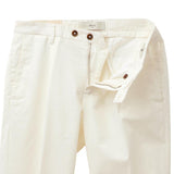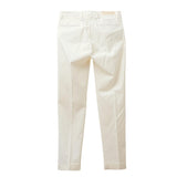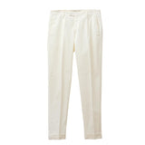まず定番中の定番が、1プリーツのコットンパンツ「BG07」。ストレッチ性のあるツイル織りのコットン生地は、はいた瞬間から心地よく、それでいて見た目は驚くほどエレガントです。スリムなシルエットにワンプリーツを組み合わせることで、カジュアルにもジャケットにも自然になじみます。製品染めのコットンならではの味わいがはき込むほどに増していくのも魅力で、どこか昔のラルフ・ローレンのチノーズを彷彿とさせる雰囲気がありながら、あくまでイタリア仕立ての美しさがあります。個人的にも毎シーズン買い足しているモデルで、気づけば全色揃ってしまいました。なかでも出番が多いのはホワイト、ネイビー、グレー。この3本があれば、一年中活躍してくれます。