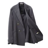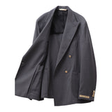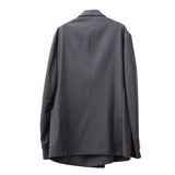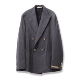ラペルは凛とした表情を演出するピークドラペルを採用し、ダブルブレストならではの貫禄を上品に昇華。フロントにはメタルボタンを配し、クラシックなムードの中に程よい華やかさを添えています。胸元はバルカポケット、腰はパッチポケットを組み合わせ、ドレス感と軽快さのバランスを調整。背面はサイドベンツ仕様で可動域を確保し、着用時の立ち姿も美しく整えます。