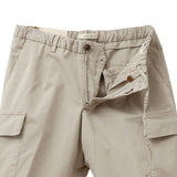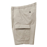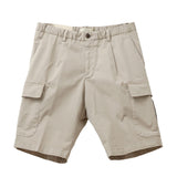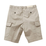 両サイドのフラップ付きカーゴポケットが程よいアクセントになりつつ、片玉縁ポケットがカジュアル感を抑えて上品な印象に。BRIGLIA刻印ボタンがさりげない高級感を添え、涼しく穿けるのにラフになりすぎない、きれいめカーゴショーツに仕上がっています。