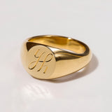 形状は、写真のクッション(四角型)とオーバル(楕円形)、ラウンド(丸型)の3種類。素材は18Kのイエローゴールドで、オーダーしてから約6カ月間でできあがります。実際にはめてみたらエングレービング(彫刻の技法)も美しいし、小指にはめたときのボリュームや肌なじみもいいんですよね。