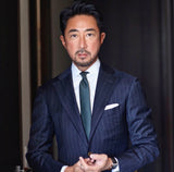 僕の顔でもあるグレースーツに、この数年合わせているのは、細身の黒のネクタイ。もちろん無地で、素材はウール。これが、クラシックなスーツに合わせると、映画『007』のジェームズ・ボンドのようにシャープな印象に見せてくれるんですよね。現代的に見えるし。ネクタイ幅が細いと、上着を脱いだ時に胸幅が広く見えるから、目の錯覚で顔が小さく見えるのもポイント。それの新作ネイビーが今回登場!